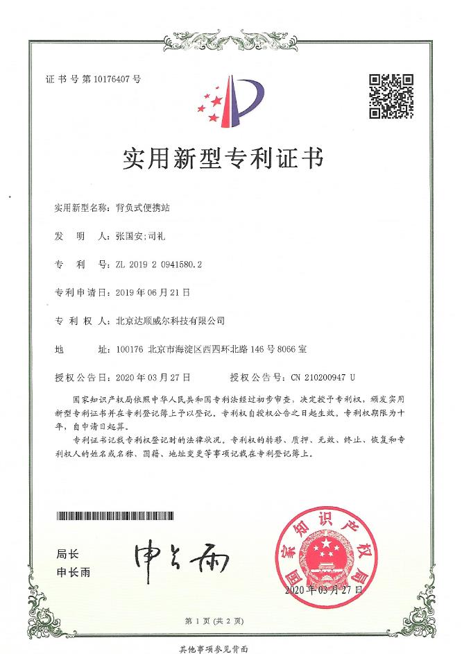 实用新型专利证书10176407:背负式便携站
